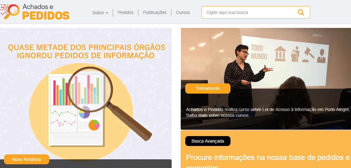Financiado pela Fundação Ford, o site www.achadosepedidos.org.br foi criado para facilitar o acesso de profissionais de comunicação e da população em geral a dados públicos, reunindo solicitações de cidadãos e respostas da administração pública feitas via Lei de Acesso à Informação (LAI). A ideia é permitir que as pessoas exerçam o direito de saber, por exemplo, quanto se gasta com funcionários em determinado órgão público, ou a quantidade de água desperdiçado no transporte até as casas feito pela concessionária do serviço, para citar dois exemplos.