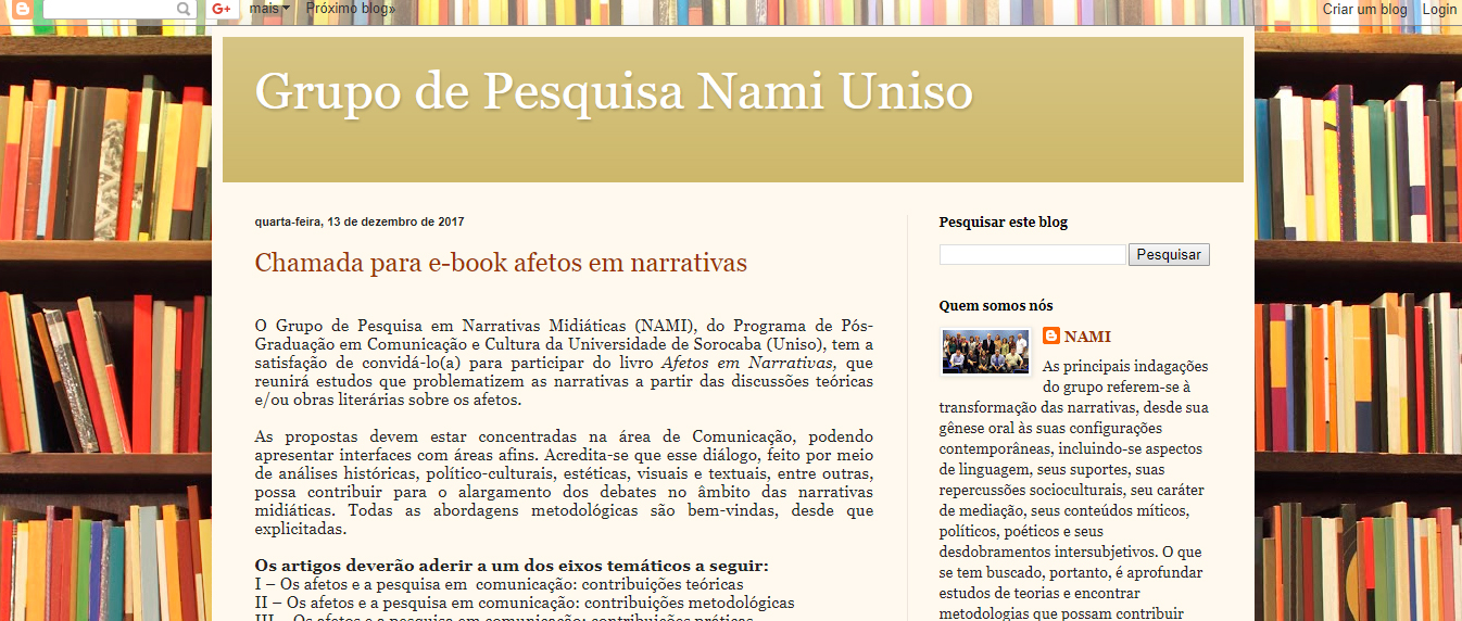 O Grupo de Pesquisa em Narrativas Midiáticas (NAMI), do Programa de Pós-Graduação em Comunicação e Cultura da Universidade de Sorocaba (Uniso), convida autores para participar do livro Afetos em Narrativas, que reunirá estudos que problematizem as narrativas a partir das discussões teóricas e/ou obras literárias sobre os afetos. Os textos devem estar concentradas na área de Comunicação. O diálogo proposto, feito por meio de análises históricas, político-culturais, estéticas, visuais e textuais, entre outras, pode contribuir para o alargamento dos debates no âmbito das narrativas midiáticas. Todas as abordagens metodológicas são bem-vindas, desde que explicitadas.