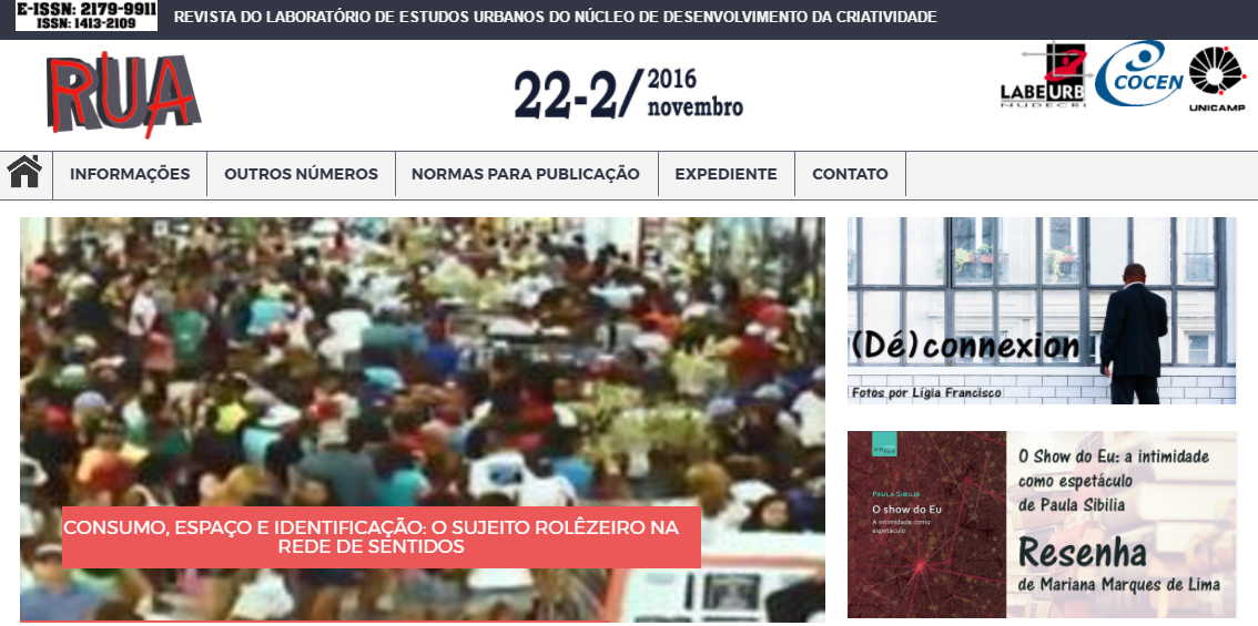 A revista Rua recebe artigos, em fluxo contínuo, para os números de 2017 e 2018. O periódico se propõe a criar condições para um debate multi e interdisciplinar, sustentado pela reflexão sobre a linguagem, divulgando artigos acadêmicos e produções artísticas que busquem compreender o espaço urbano como objeto de estudo. É uma publicação que reúne obras que tratem de práticas da cidade a partir das dimensões do simbólico e do político em uma relação entre o saber urbano e a linguagem, com o objetivo de refletir sobre o espaço urbano concebido como espaço de significação, propiciando um diálogo entre diferentes áreas do conhecimento.