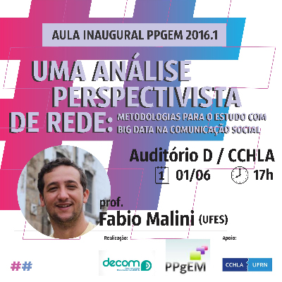No dia 1º de junho, será realizada na Universidade Federal do Rio Grande do Norte a aula inaugural do Programa de Pós-Graduação em Ciências Sociais. O professor Fabio Malini, da Universidade Federal do Espírito Santo, falará sobre “Uma análise perspectivista de rede: metodologias para o estudo com big data na comunicação social”.