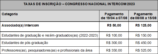 O Intercom 2023 recebe inscrições até o dia 15 de agosto, com valores que variam conforme a categoria e a data de inscrição. Os períodos e respectivos valores de inscrição foram ajustados de acordo com o calendário de submissões, de forma estender o primeiro período aos autores e autoras que tiverem seus resumos aceitos. Confira na tabela: