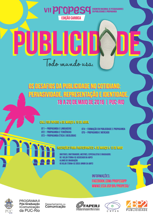 O VII PróPesq PP - Encontro Nacional de Pesquisadores em Publicidade e Propaganda acontecerá nos dias 18, 19 e 20 de maio, na PUC-Rio. A abertura do evento será feita por quatro conferencistas: Arthur Asa Berger (University State of San Francisco), Ruth Adams (King´s College London), e, da PUC-Rio, Everardo Rocha e Roberto DaMatta. Pesquisadores do Chile, Espanha, Portugal e Equador, além de brasileiros de todos os estados, estarão presentes apresentando trabalhos. O evento é aberto também a alunos de pós-graduação e graduação. Para saber como participar, acesse http://www2.eca.usp.br/propesq/index.html.