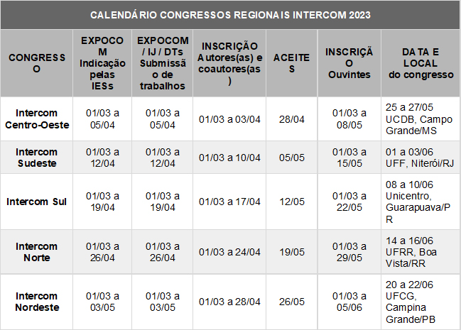 Para os calendários e taxas, acesse a página dos congressos regionais no Portal Intercom: https://bit.ly/Regionais_Intercom_2024.