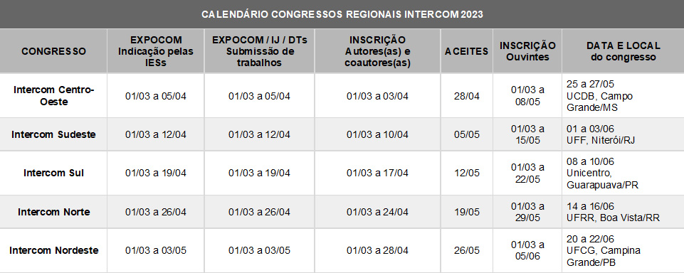 Além do Centro-Oeste, a Intercom realiza outros quatro congressos regionais. Em todos, há chamada de trabalhos para Divisões Temáticas, Intercom Júnior e Expocom, além de programação acadêmica e científica que será divulgada em breve.