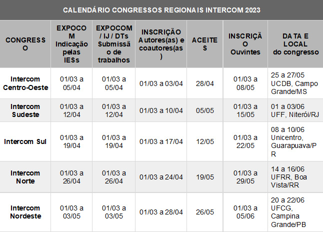 O Intercom Centro-Oeste 2023 encerra hoje (05/04) sua chamada de trabalhos, seguido pelo Sudeste (12/04), Sul (19/04), Norte (26/04) e Nordeste (03/05). Confira o calendário completo: