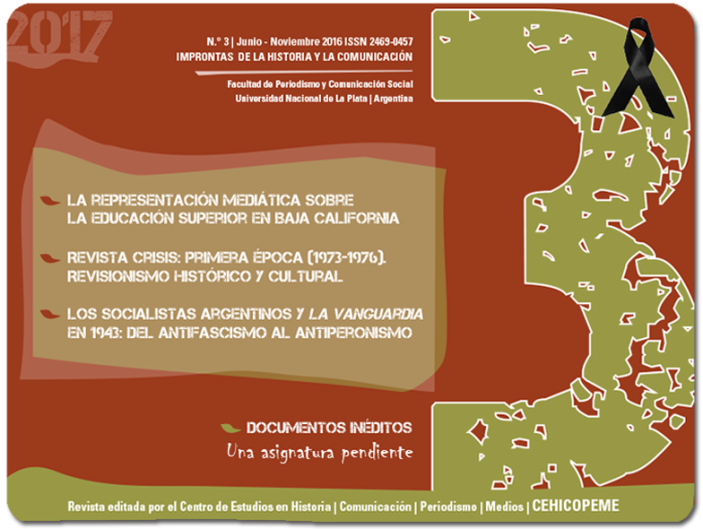 A revista argentina Improntas, publicada pela da Universidade de La Plata, trata de história, comunicação, periodismo e meios. Em seu terceiro número, o periódico traz dez textos, nas seções de artigos livres e vinculados ao dossiê, resenhas e sínteses de teses. Entre eles “Los socialistas argentinos y La Vanguardia en 1943: del antifascismo al antiperonismo”, de Claudio Panella, e “Cristianismo y Revolución. El origen de Montoneros violencia, política y religión en los 60”, de Mauro Castro