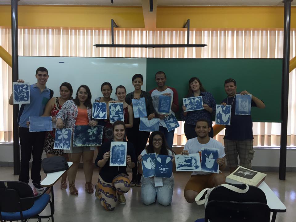 Em um dia de muitas oficinas e minicursos, a professora Eliani Covem falou aos participantes sobre a técnica de criação e produção de um documentário. Já a professora Mariana Capeletti, ao abordar o tema “Arte e fotografia”, explicou quais são as principais formas de impressão fotográfica e colocou em prática a cianotipia. Imagens pessoais em negativo, flores e folhas foram colocados em contato com produtos químicos, expostos ao sol e depois molhados para que a imagem tomasse forma.