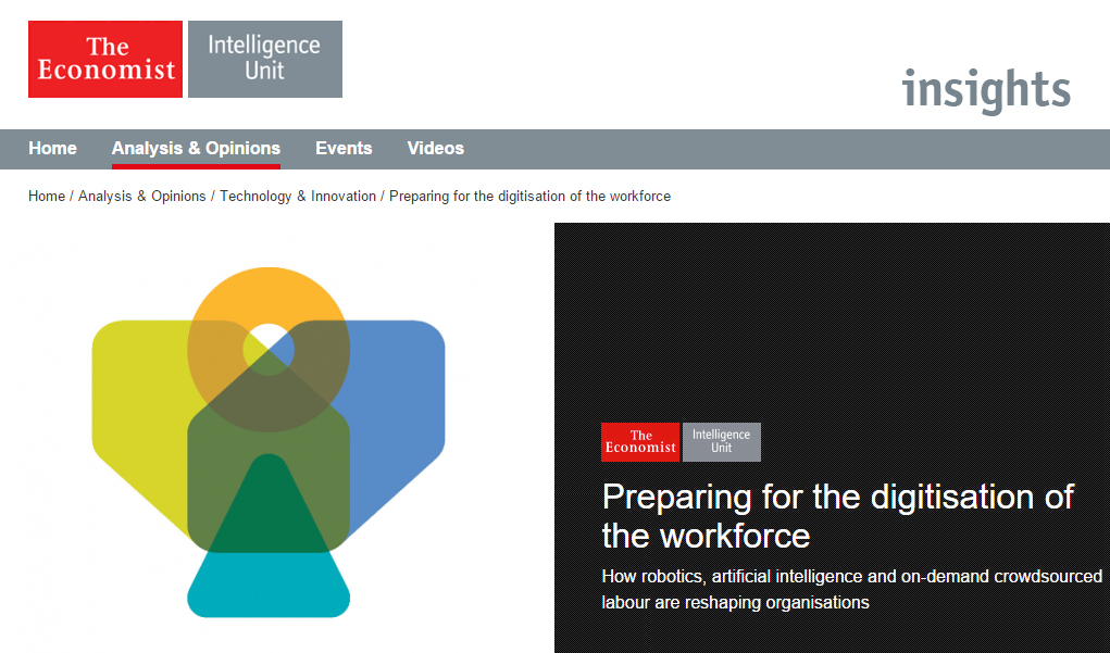 Um estudo denominado "Preparação para a digitalização da força de trabalho” (Preparing for the Digitization of the WorkForce), realizado pela consultoria Everis em parceria com a revista inglesa The Economist, mostra como robôs e softwares de inteligência artificial estão mudando a natureza do trabalho no século 21 e como as organizações estão se preparando para essa revolução. Para a produção do relatório, foram ouvidos 228 executivos de empresas nos Estados Unidos, Europa, América Latina e Ásia-Pacífico. Profissionais de comunicação interessados em conhecer o impacto estimado dessa mudança podem baixar o documento completo (em inglês), no link http://www.economistinsights.com/technology-innovation/analysis/preparing-digitisation-workforce.