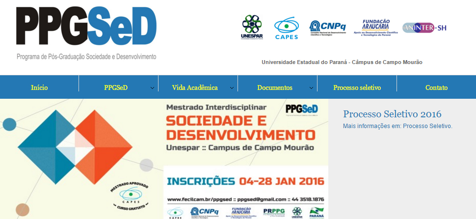 Foi lançado o edital para inscrições no Mestrado Interdisciplinar em Sociedade e Desenvolvimento da Universidade Estadual do Paraná (Unespar). O Programa de Pós-Graduação Sociedade e Desenvolvimento (PPGSeD) é dividido nas linhas “Formação humana, processos socioculturais e instituições” e “Formação humana, políticas públicas e produção do espaço”. Por sua proposta, o mestrado possibilita a participação de profissionais de áreas como Comunicação, História, Geografia, Pedagogia, Letras, Matemática, Administração, Ciências Econômicas, Ciências Contábeis, Serviço Social, Turismo, Filosofia e Sociologia.