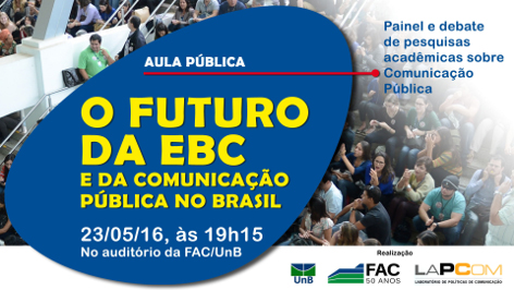 Uma aula pública com o título “O Futuro da EBC e da Comunicação Pública no Brasil” vai acontecer no dia 23 de maio, às 19h15, no auditório da FAC/UnB, em Brasília. Haverá um painel com debate sobre pesquisas acadêmicas que tratam do tema. O evento é uma realização da linha de pesquisa Políticas de Comunicação e de Cultura e do Laboratório de Políticas de Comunicação (LAPCOM), do Programa de Pós-graduação em Comunicação, da Universidade de Brasília (PPG-FAC-UNB).