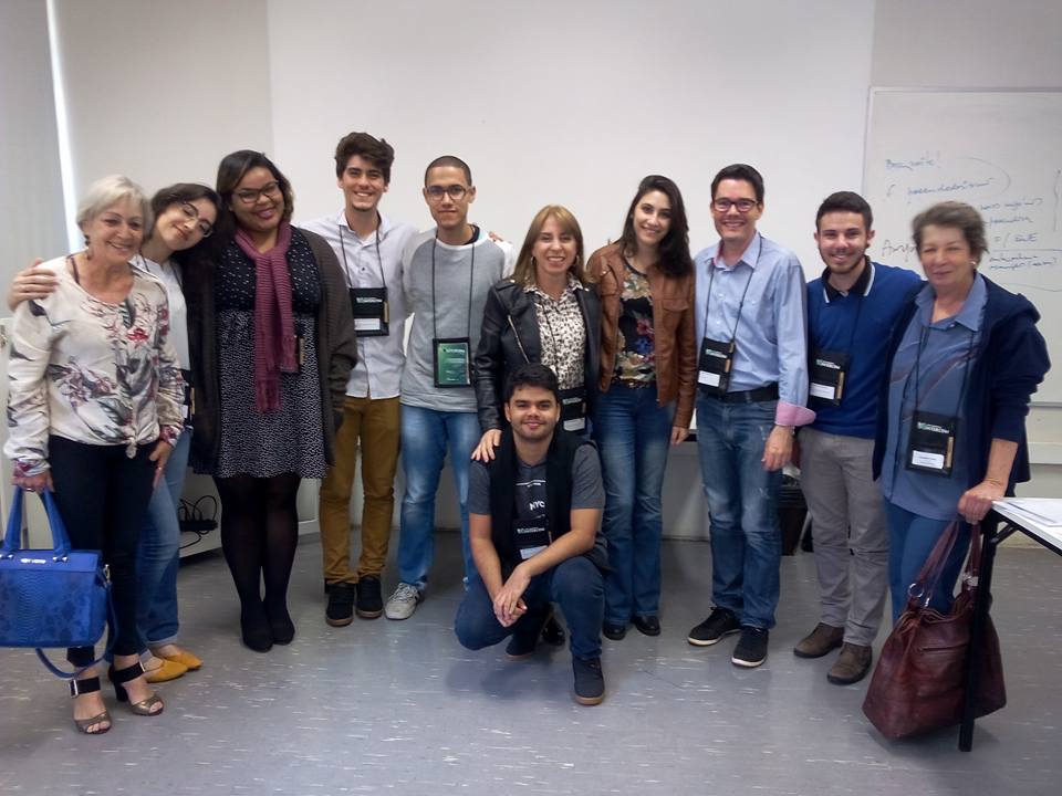 Apresentações nas Divisões Temáticas de Comunicação Audiovisual (acima, à esq.), Estudos Interdisciplinares (acima, à dir.), Relação Públicas e Comunicação Organizacional (na sequência, à esq), Publicidade e Propaganda (na sequência, à dir.), Multimídia (na sequência, à esq.), Interfaces Comunicacionais (na sequência, à dir.) e Comunicação, Espaço e Cidadania (na sequência, à esq.). À dir., autores de trabalhos de Relações Públicas, que fizeram parte da programação do Intercom Júnior, posam para foto.