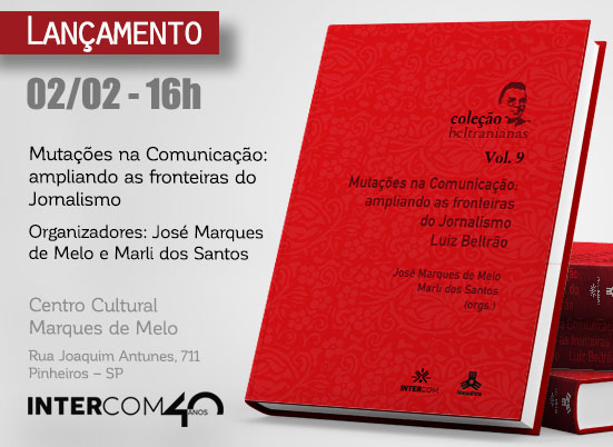Será lançado no dia 2 de fevereiro, no Centro Cultural Marques de Melo, o livro Mutações na Comunicação: ampliando as fronteiras do Jornalismo (Coedição Intercom/UMESP). Contando com a organização dos professores José Marques de Melo e Marli dos Santos, a obra reúne 22 textos de Luiz Beltrão, jornalista e pesquisador pioneiro em Comunicação no Brasil, analisados por pesquisadores de várias instituições brasileiras. O livro traz contribuições acerca do pensamento do autor no cenário de transformações que o mundo e o Brasil vivenciaram durante as décadas de 1960, 70 e 80, revelando um rico universo e ampliando as fronteiras na pesquisa e na prática da comunicação e do jornalismo no passado e no presente.