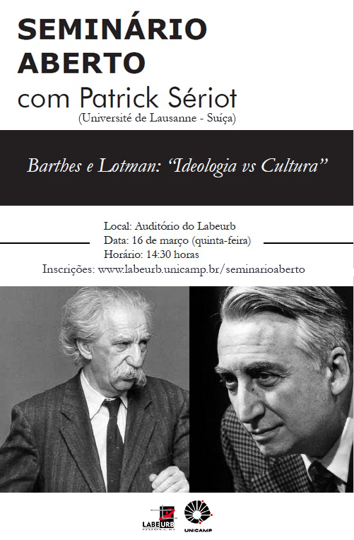 O Labeurb, Laboratório de Estudos Urbanos da Unicamp, vai promover no dia 16 de março o seminário aberto "Barthes e Lotman : ideologia versus cultura", com Patrick Sériot, titular da cadeira de linguística eslava na Universidade de Lausanne, na Suíça, e especialista em história e em epistemologia do discurso sobre a língua na Rússia e na União Soviética.