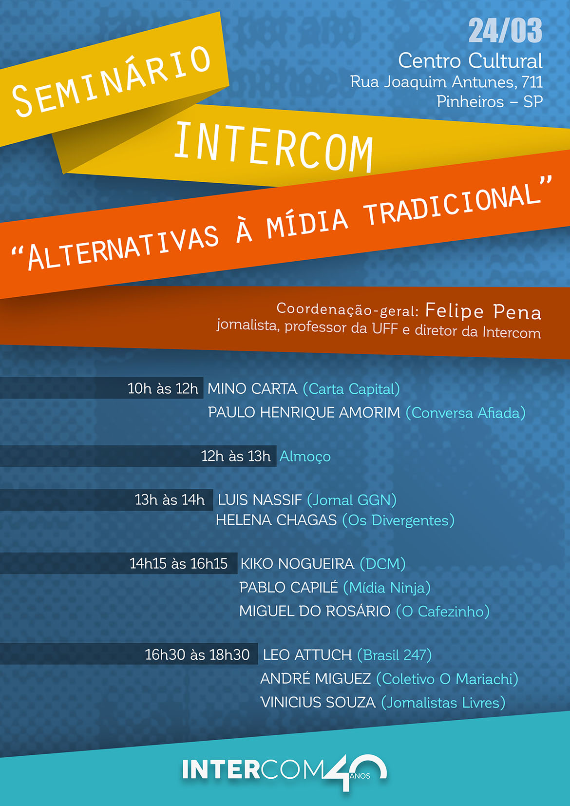 Esta semana, no dia 24 de março, acontecerá o seminário “Alternativas à mídia tradicional”, no Centro Cultural Marques de Melo, em São Paulo. O encontro, promovido pela Intercom e coordenado por seu diretor Editorial, Felipe Pena, contará com a presença, para debater o tema central, de Mino Carta, da Carta Capital; Luis Nassif, do Jornal GGN; Paulo Henrique Amorim, do Conversa Afiada; Helena Chagas, de Os Divergentes; Kiko Nogueira, do DCM; Pablo Capilé, da Mídia Ninja; Miguel do Rosário, de O Cafezinho; Leo Attuch, do Brasil 247; André Miguez, do coletivo O Mariachi; e Vinícius Souza, do coletivo Jornalistas Livres.