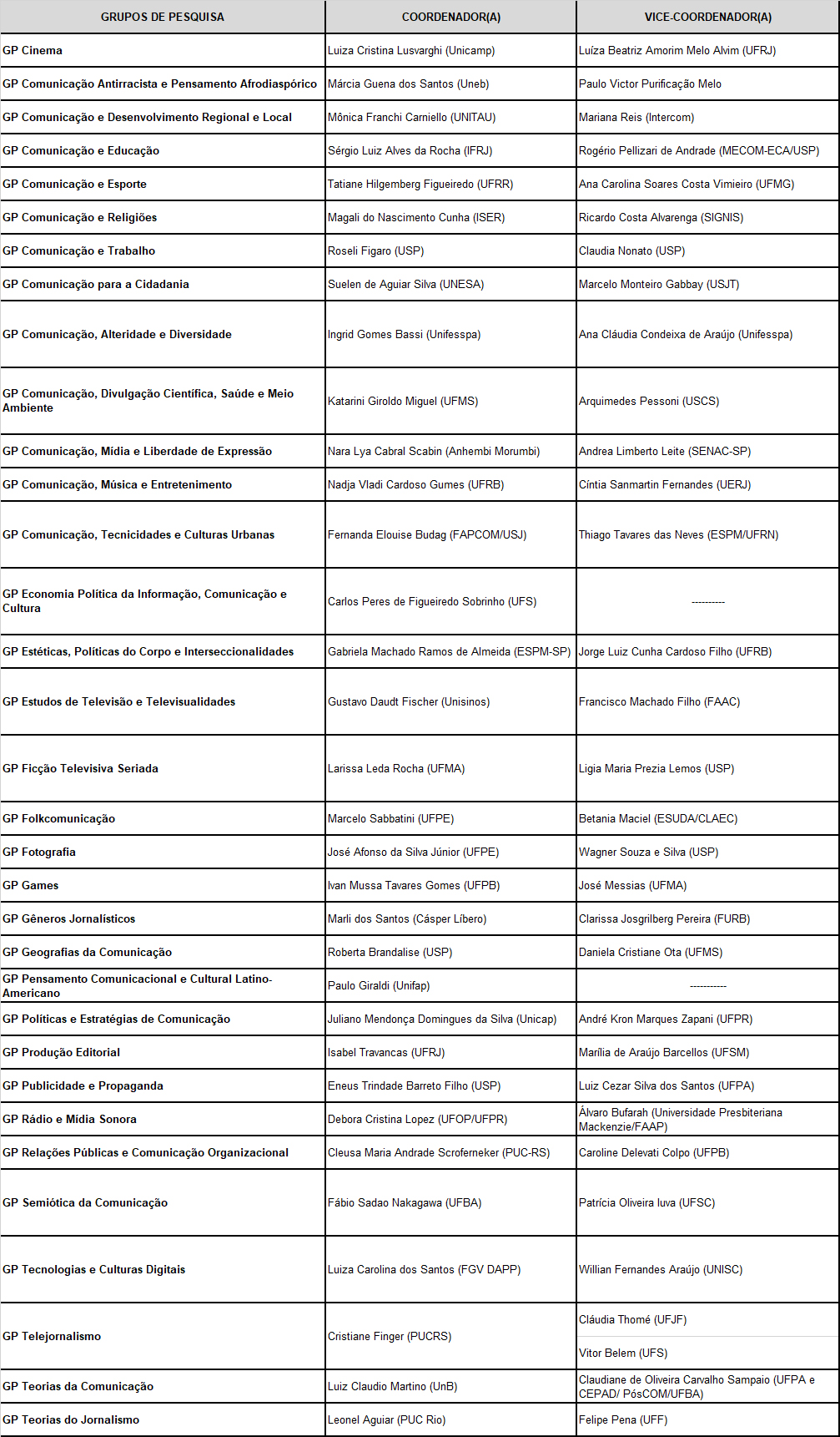 Já estão ativados os novos Grupos de Pesquisa (GPs) da Sociedade Brasileira de Estudos Interdisciplinares da Comunicação (Intercom). Ao todo, são 33 GPs, abrangendo as mais diversas áreas do campo interdisciplinar da Comunicação e selecionados criteriosamente a partir da chamada pública realizada em 2021.