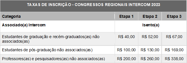 ● Associados(as) ativos(as) da Intercom têm isenção da taxa de inscrição nos cinco congressos regionais. A anuidade 2023 está com desconto até o dia 31 de março, no valor de R$ 207. Para saber mais sobre os benefícios e sobre como se associar, clique aqui.