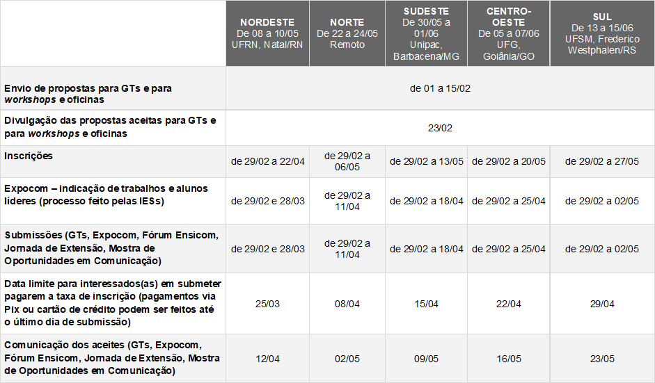 Com as mudanças implementadas neste ano, os congressos regionais da Intercom passam a incluir um período para o envio de propostas de Grupos de Trabalho (GTs) e de workshops e oficinas, que será o mesmo para os cinco eventos: de 1º a 15 de fevereiro. A data de abertura das inscrições e submissões também será a mesma para todos os regionais, 29 de fevereiro, porém com prazos diferentes para cada congresso. As chamadas serão publicadas antes do início das submissões e incluirão: submissão de resumos expandidos para os GTs aceitos para cada congresso; Expocom (indicação pelas instituições de ensino superior e submissão dos trabalhos pelos alunos líderes); propostas para Fórum Ensicom, Jornada de Extensão e Mostra de Oportunidades em Comunicação.