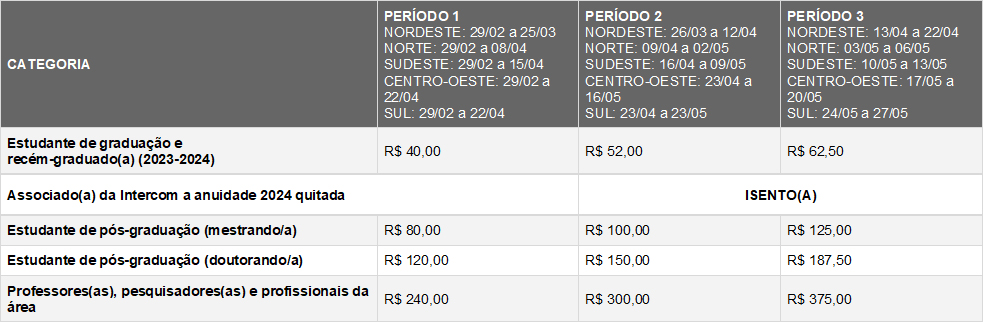 Para ter o benefício da isenção da taxa, basta fazer ou atualizar o cadastro de associado(a) e quitar a anuidade 2024, cujo valor é o mesmo dos dois últimos anos (R$ 230). Quem pagar a anuidade até 31 de janeiro tem 20% de desconto (R$ 184); de 1º a 28 de fevereiro, o desconto é de 10% (R$ 207). Além da isenção nos congressos regionais, associados(as) ativos(as) terão desconto especial ao se inscreverem no congresso nacional Intercom 2024, que será realizado no segundo semestre. Acesse o Sistema Unificado Intercom, faça ou atualize seu cadastro e aproveite!