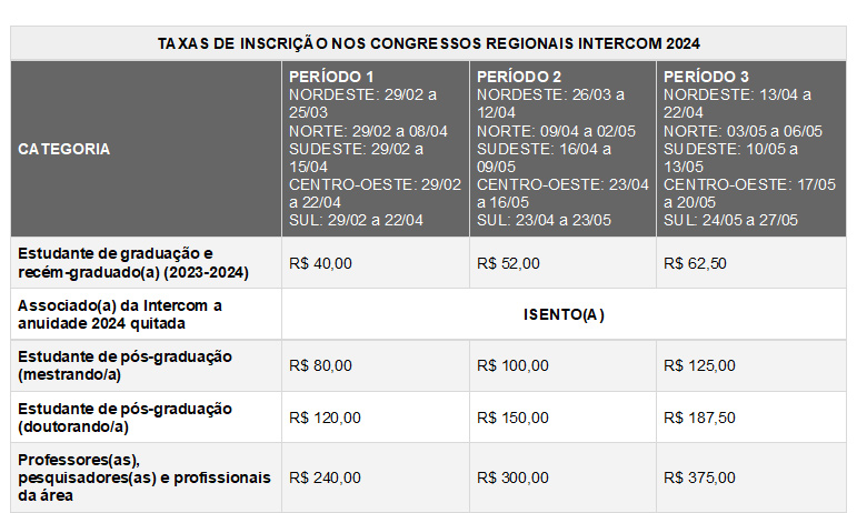 Para os calendários e taxas, acesse a página dos congressos regionais no Portal Intercom: https://bit.ly/Regionais_Intercom_2024.