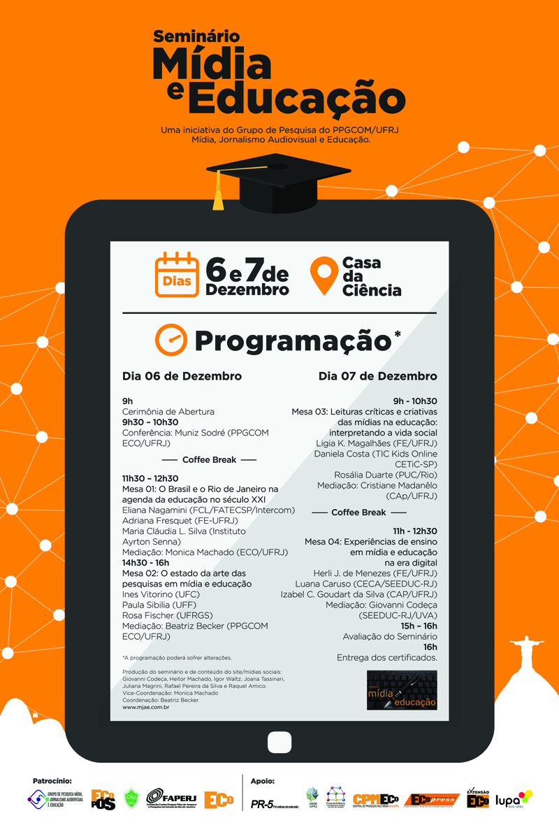 O Seminário Mídia e Educação, promovido pelo Grupo de Pesquisa Mídia, Jornalismo Audiovisual e Educação (MJAE), do Programa de Pós-Graduação em Comunicação e Cultura da Escola de Comunicação da Universidade Federal do Rio de Janeiro (PPGCOM-ECO/UFRJ), acontecerá nos dias 6 e 7 de dezembro, das 9h às 16h, na Casa da Ciência, no campus da Praia Vermelha da UFRJ.