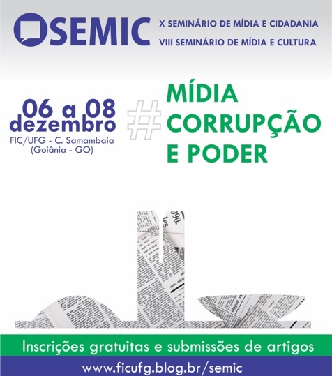 O prazo de submissão de artigos para apresentação nos Grupos de Trabalho (GTs) dos Seminários de Mídia e Cidadania e de Mídia e Cultura (Semic) foi estendido para o dia 2 de novembro. O evento será realizado na Faculdade de Informação e Comunicação da Universidade Federal de Goiás (UFG), entre os dias 6 e 8 de dezembro, e discutirá o tema “Mídia, Corrupção e Poder”.